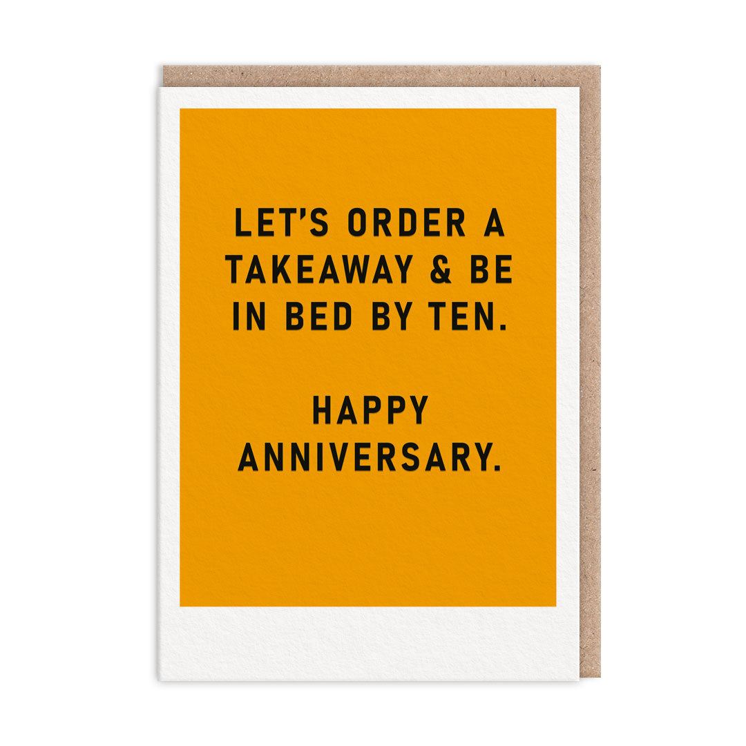 Make anniversaries fun with this playful card that reads βLetβs Order a Takeaway and Be In Bed By Ten.β Designed by Ohh Deer, it adds a humorous touch to celebrating lasting love.