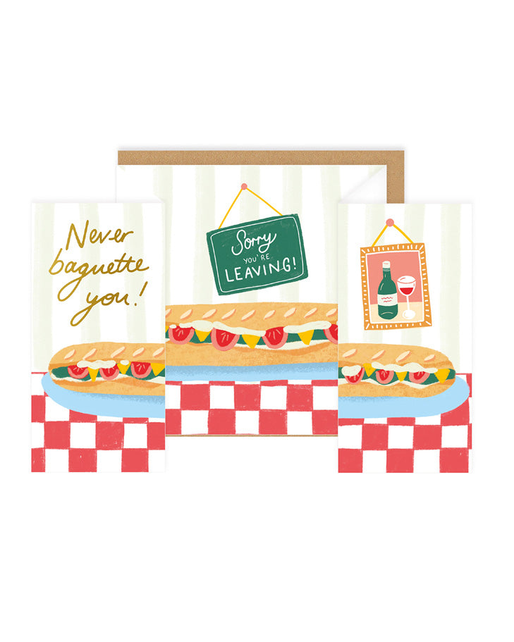 Serve up a pun-filled punch with this concertina-style card that declares, "We Will Never Baguette You." With a fun, compact design and blank inside for your message, this card is designed by Ohh Deer to delight and amuse.