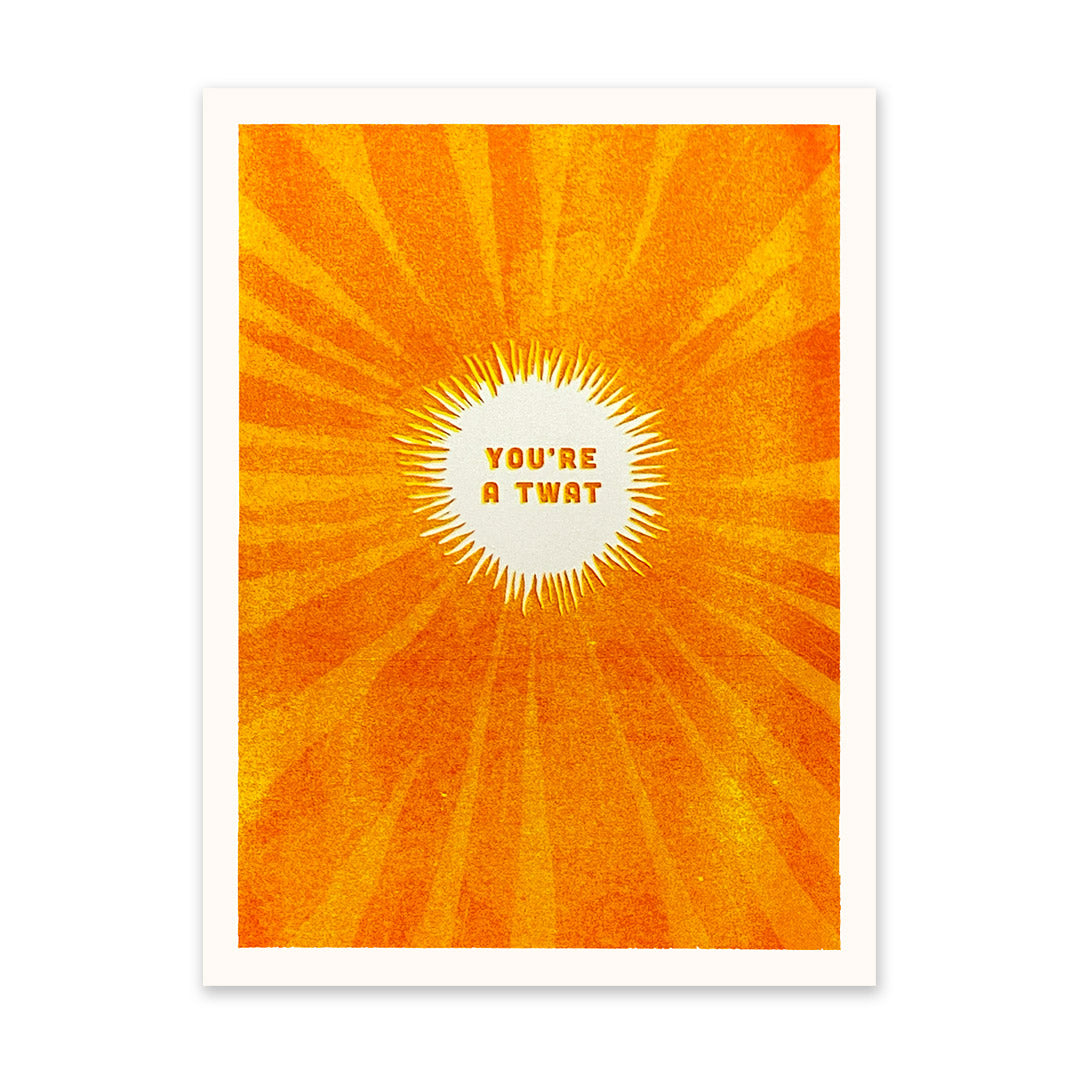 Inject playful humor into any room with our You're A Twat Art Print. Designed by Ohh Deer, this cheeky risograph print features bold colors and a humorous message, all printed sustainably for a fun, edgy look.